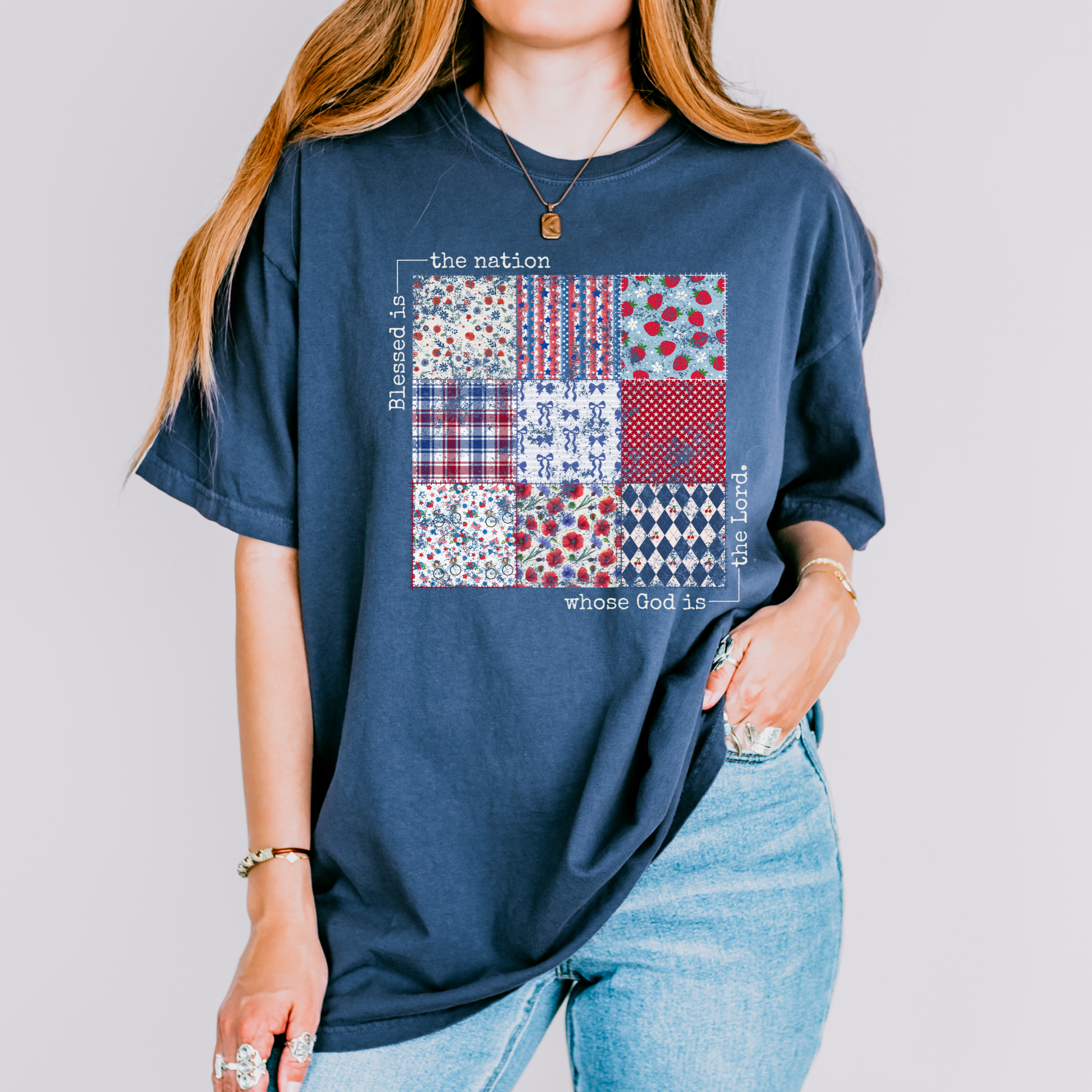 Wrap yourself in patriotic charm and timeless truth with our "Blessed Is the Nation" t-shirt, featuring a beautiful quilt block design in rich red, white, and blue tones. Inspired by the heart of Americana and anchored in Psalm 33:12 — “Blessed is the nation whose God is the Lord” — this shirt is perfect for summer gatherings, Fourth of July celebrations, and everyday wear for those who proudly walk in faith.