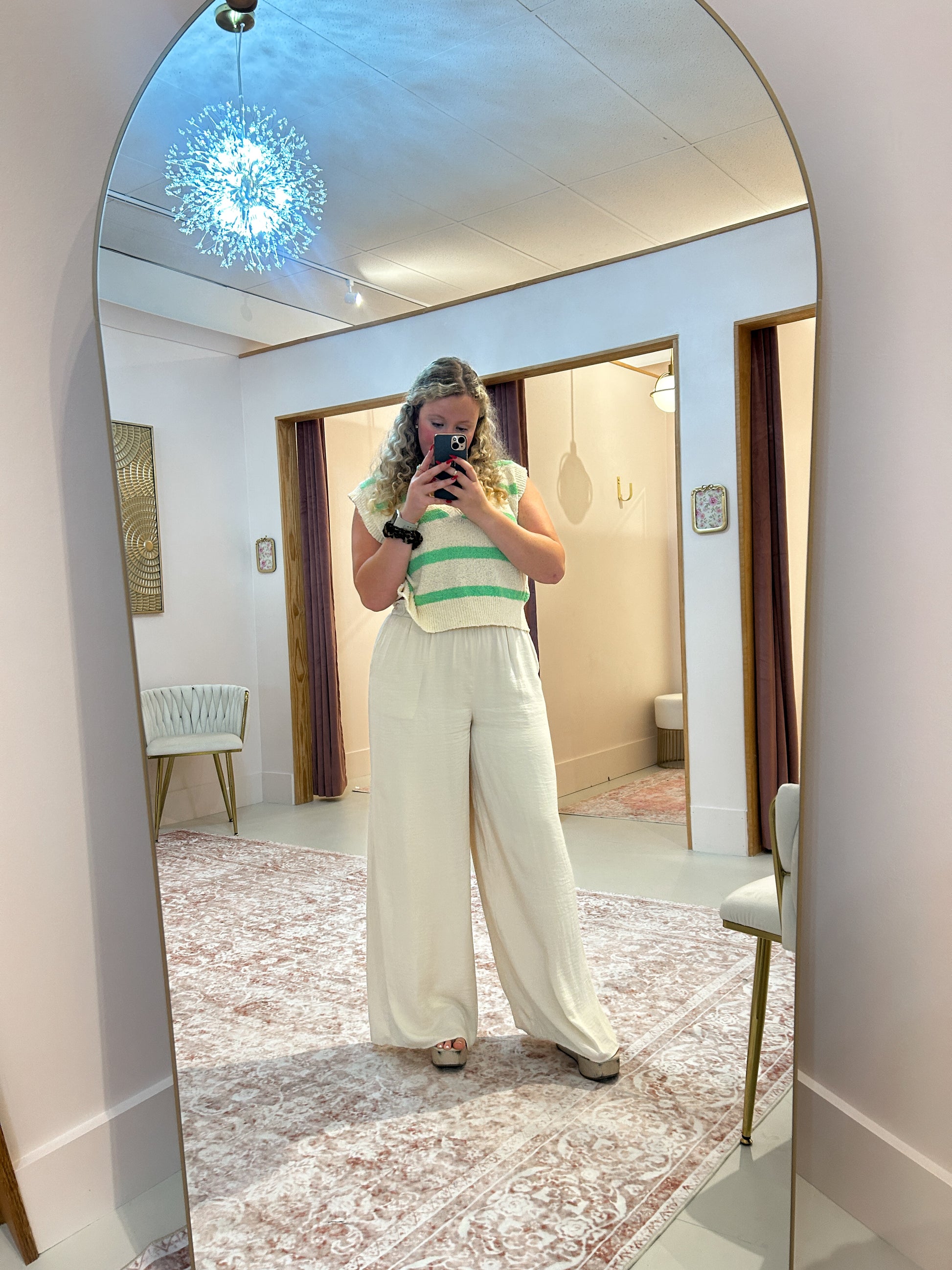 This breezy, striped knit vest is perfect for those warm spring and summer days. The lightweight, 100% polyester knit construction and horizontal stripes create a relaxed, retro-inspired look. The v-neckline and sleeveless design offer a cool and comfortable fit, making it perfect for layering over a tank top or t-shirt. Whether you're heading to the beach or running errands around town, this versatile vest is sure to become a go-to piece in your wardrobe.