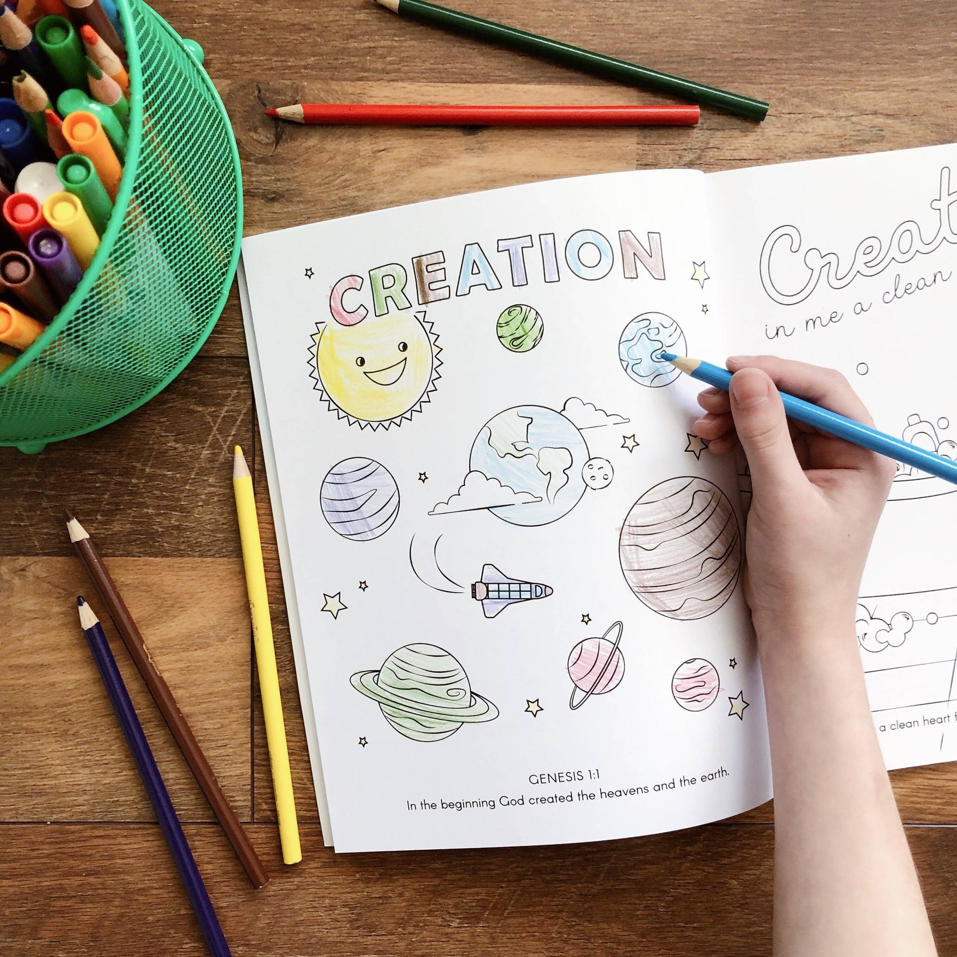 Each page has a key verse and accompanying illustrations and activities for kids to color.