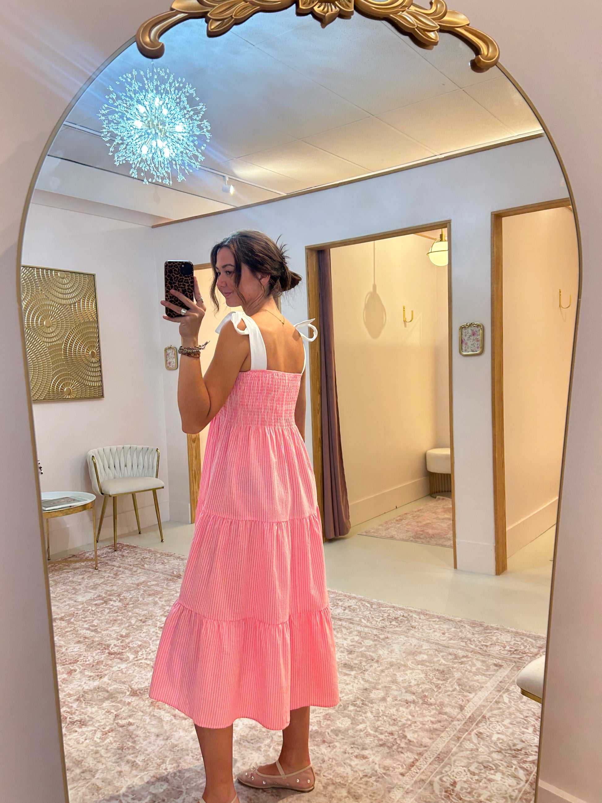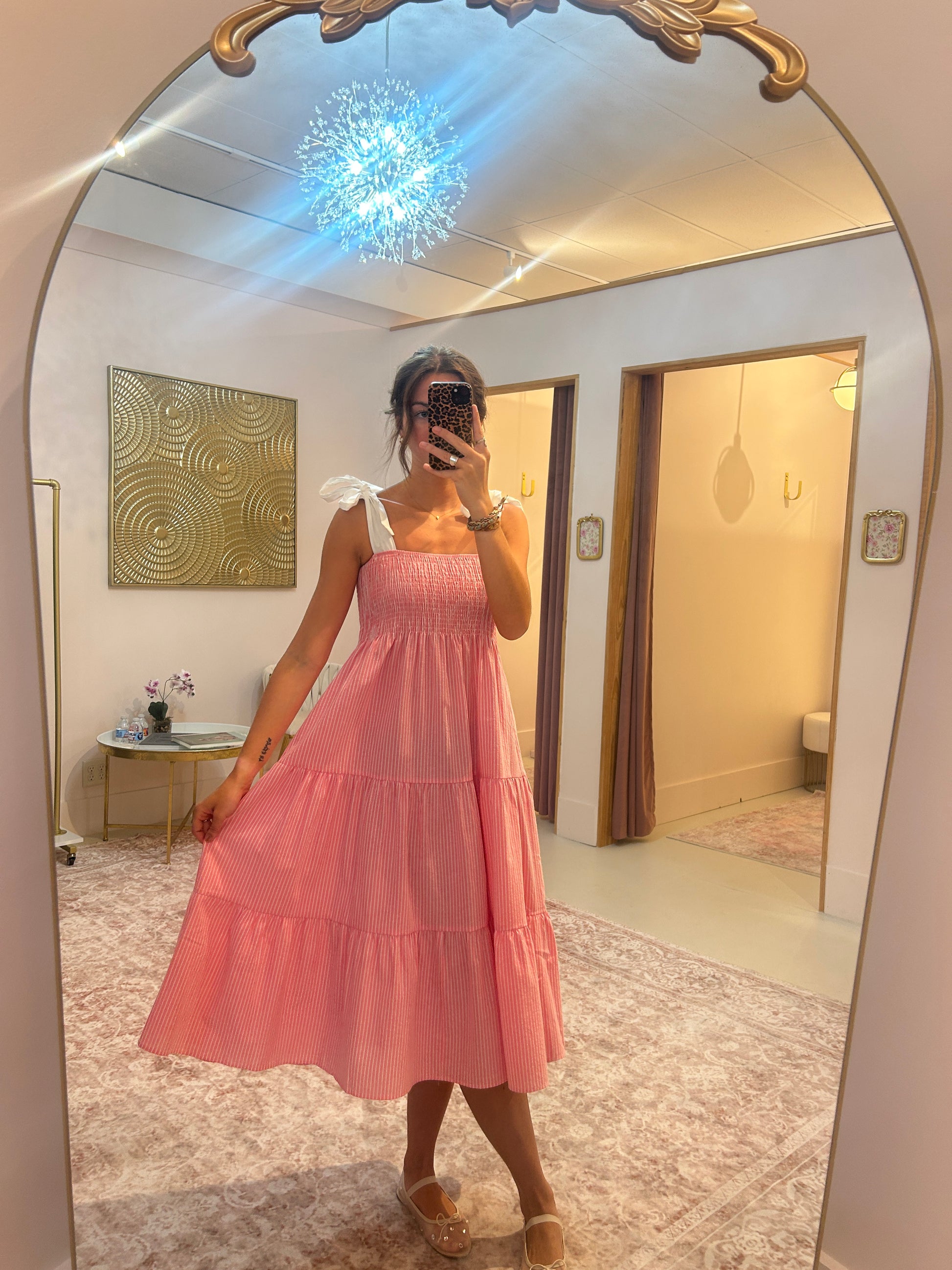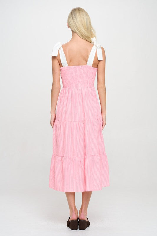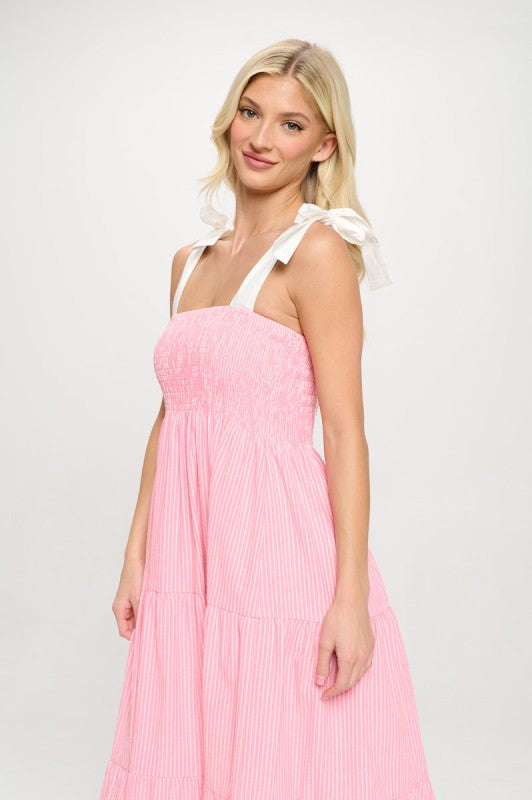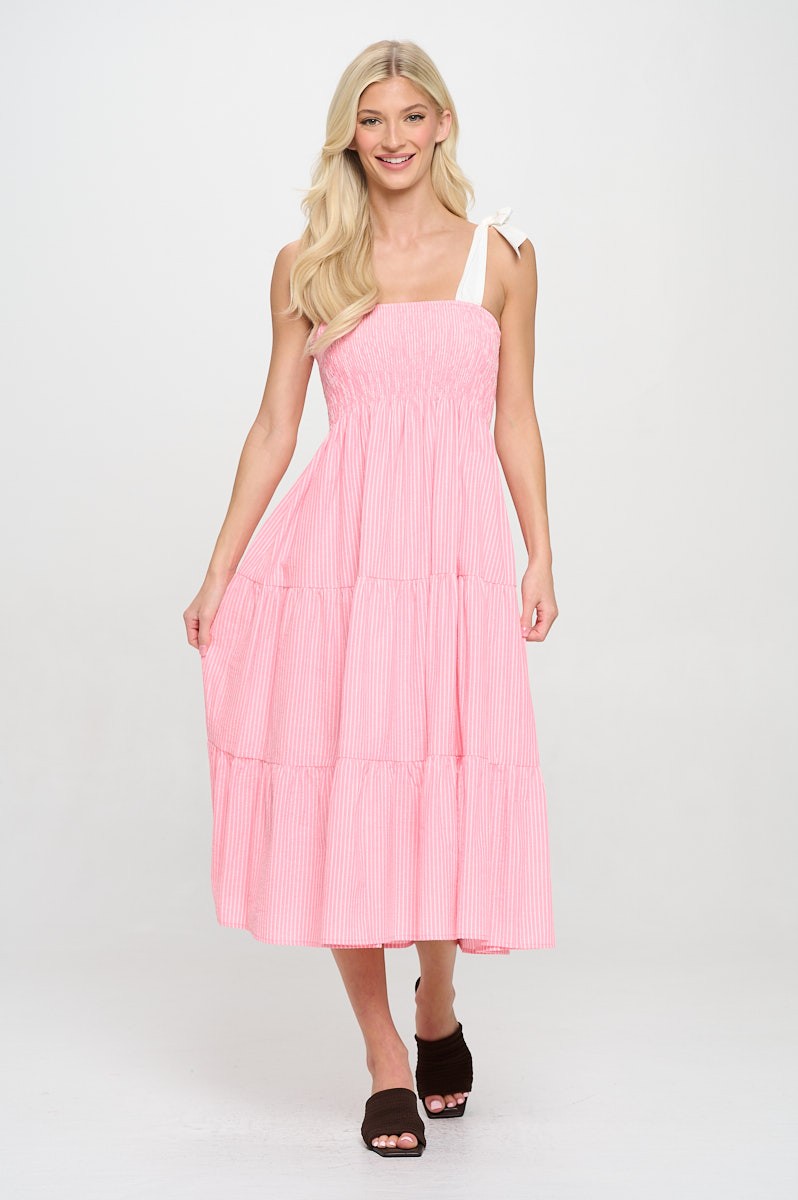 Sweet, breezy, and ready for sunshine. The Cotton Candy Stripe Midi Dress is a warm-weather essential. Designed with a stretchy smocked bodice, adjustable tie straps, and a flowy tiered skirt, this dress delivers on both comfort and charm. The soft woven cotton and subtle stripe pattern make it a go-to for resort shops and weekend-ready assortments.