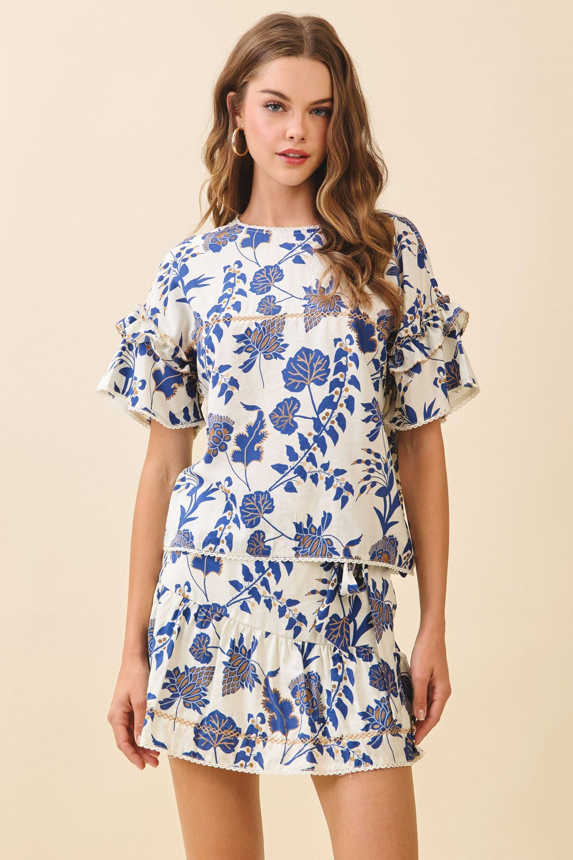 The Secret Garden Top in navy brings a playful touch to your wardrobe with its charming floral print and tiered ruffle sleeves that add movement and flair. Delicate lace trim enhances its feminine feel, making this top perfect for brightening up any casual or dressy look with effortless style.