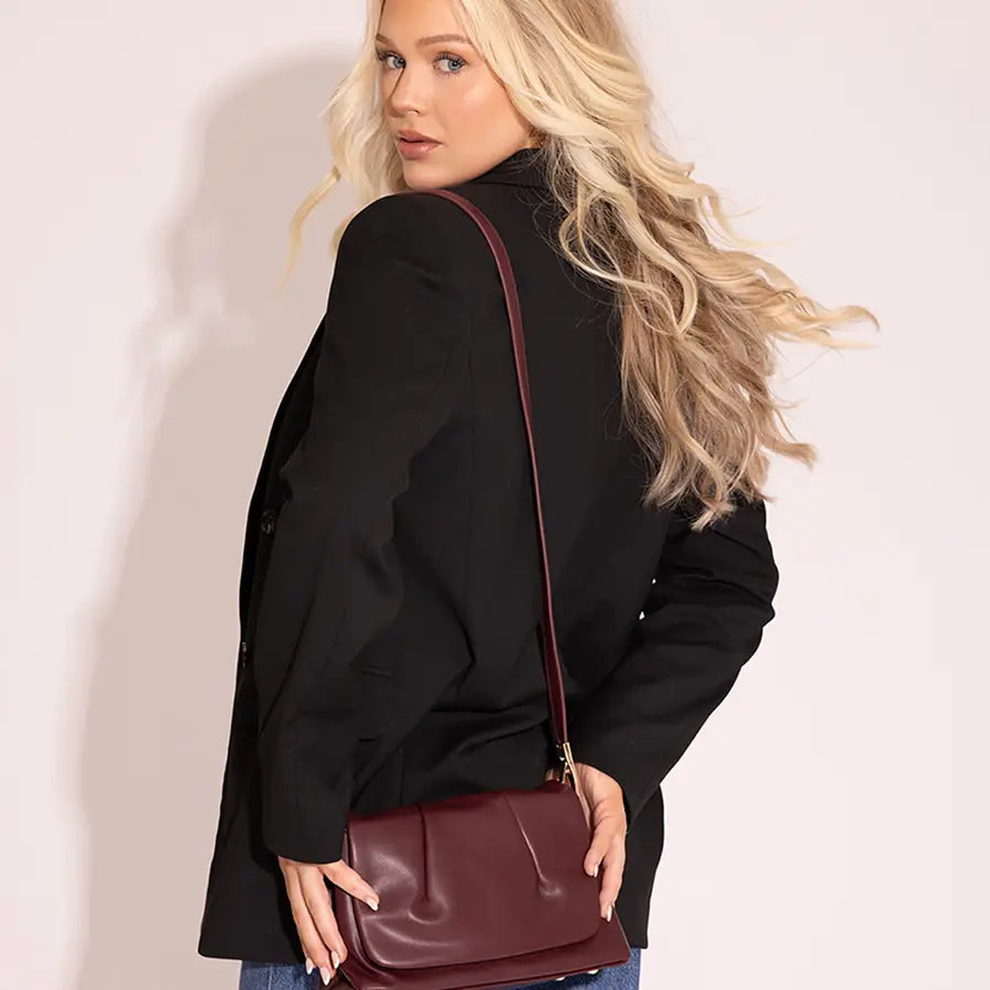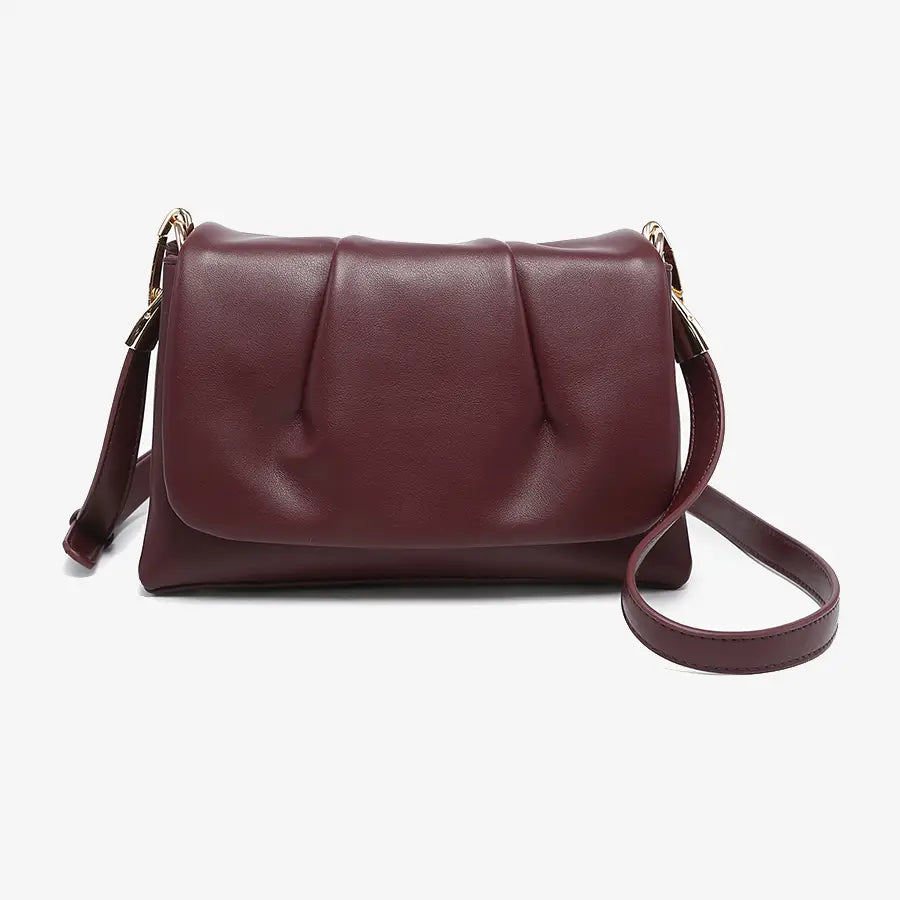 Item Detail: -Soft Vegan Leather: Smooth, flexible construction for a comfortable, easy-to-wear design. -Pleated Flapover Design: Adds texture and dimension for a refined, elevated look. -Snap Closure: Keeps contents secure while maintaining a clean silhouette. -Multi-Compartment Interior: Offers organized storage, including inner slip and zip pockets. -Adjustable/Removable Crossbody Strap: Provides versatile styling options for everyday wear. -Gold-Tone Hardware: Adds a polished, sophisticated finish. Dimensions: -Length: 10 inches -Height: 7 inches -Depth: 3 inches The Dayton Pleated Flapover Crossbody delivers a soft, structured silhouette with thoughtful details—ideal for buyers looking for a functional yet fashion-forward everyday style for Fall/Winter.