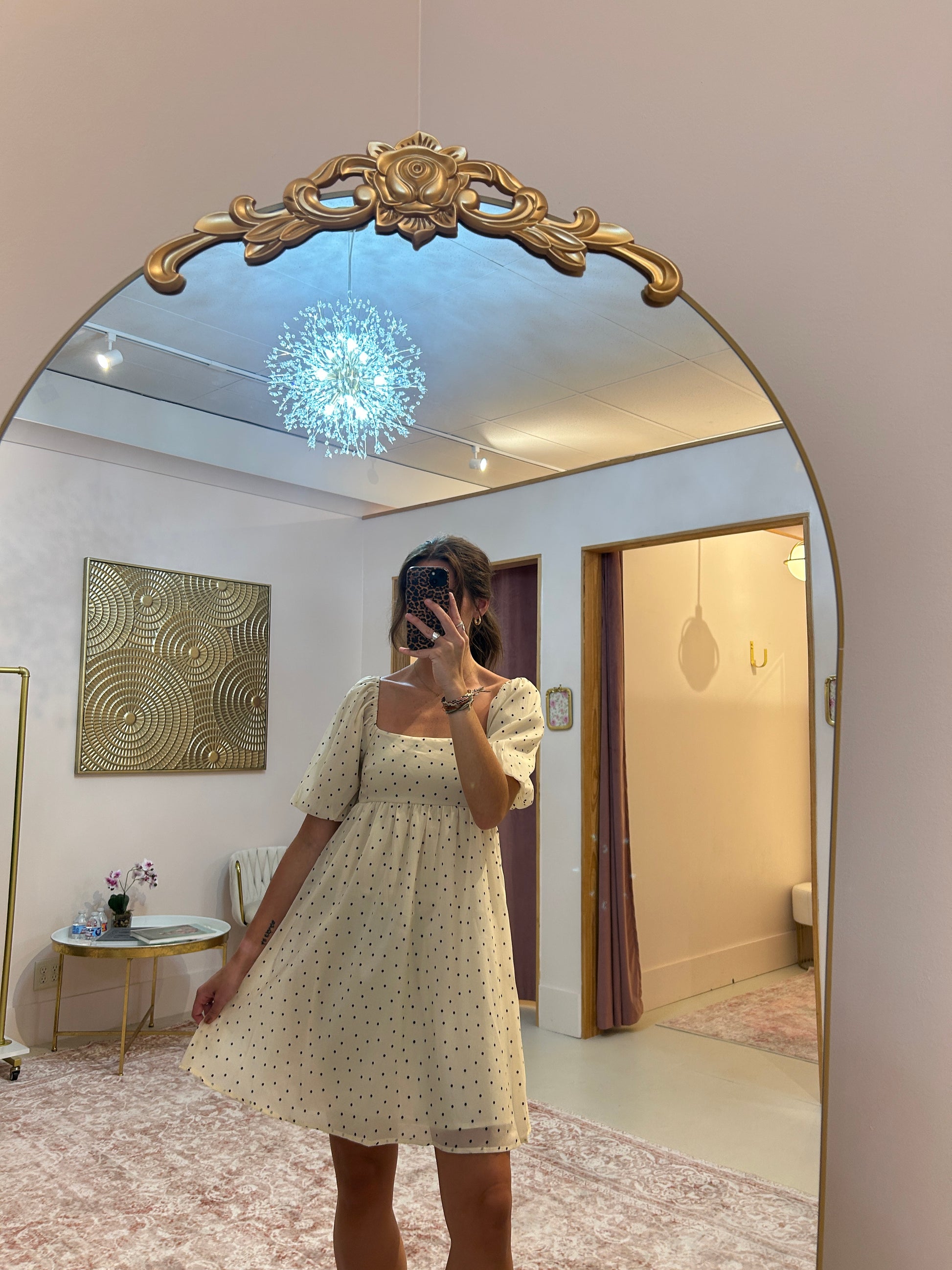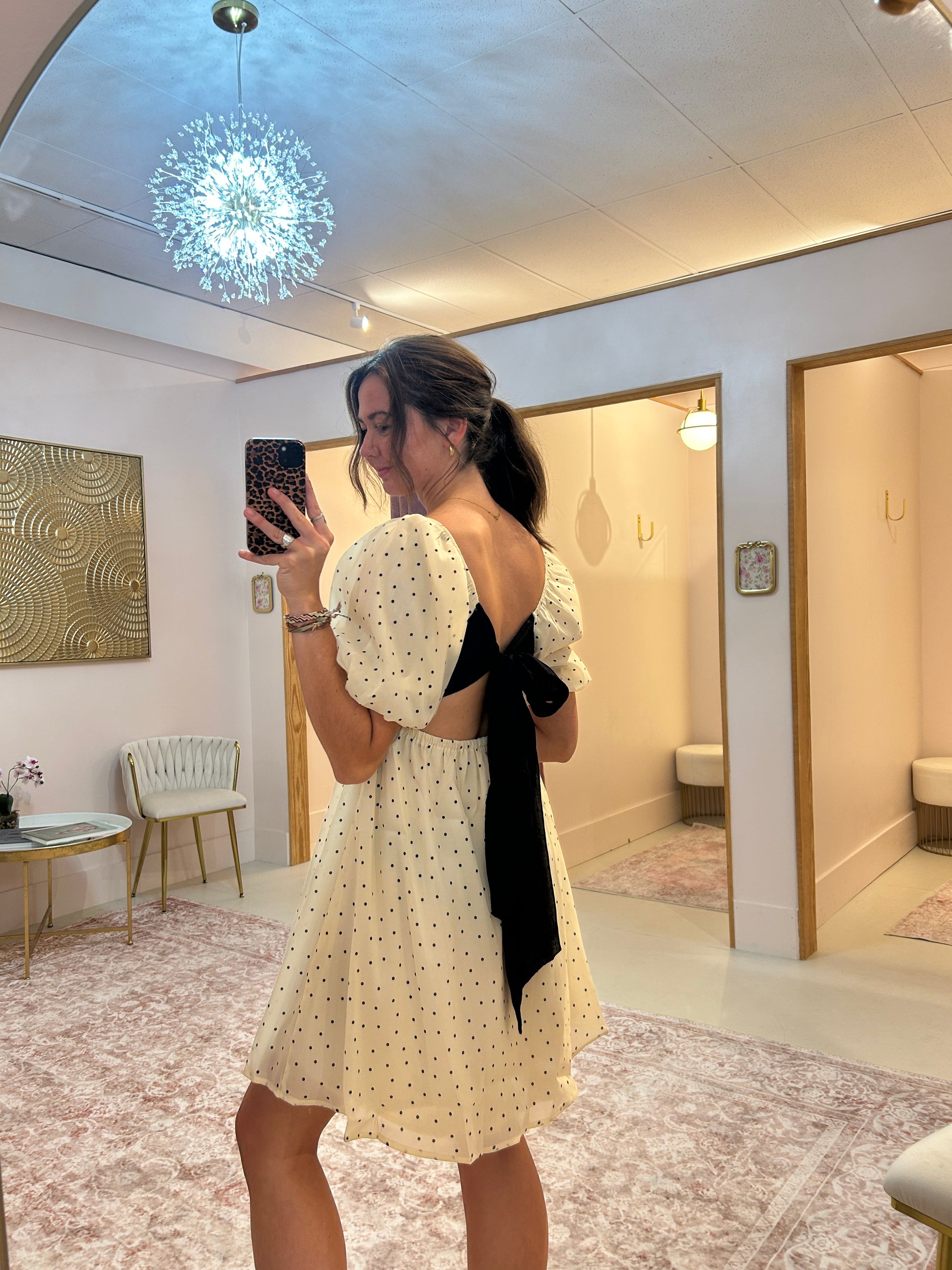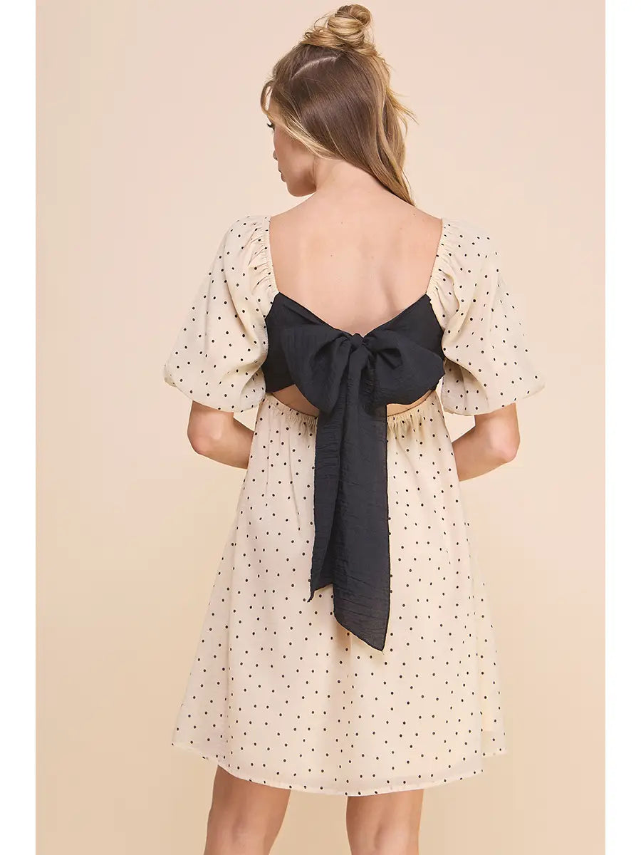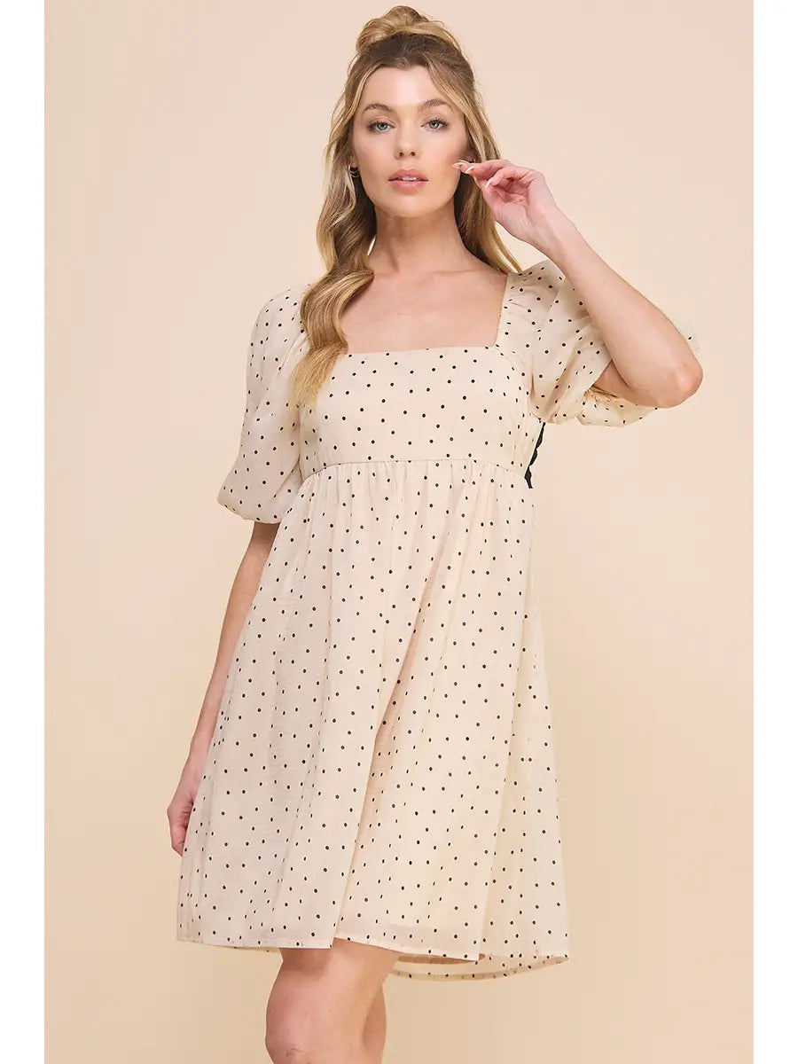 Step into whimsy with the Dotty Darling Dress, featuring soft organza puff sleeves and a tiered babydoll silhouette that dances with every move. The playful biscotti black dot print adds charm, while the contrasting back bow brings a sweet surprise from behind. Perfect for twirling through sunny days or charming evening outings.