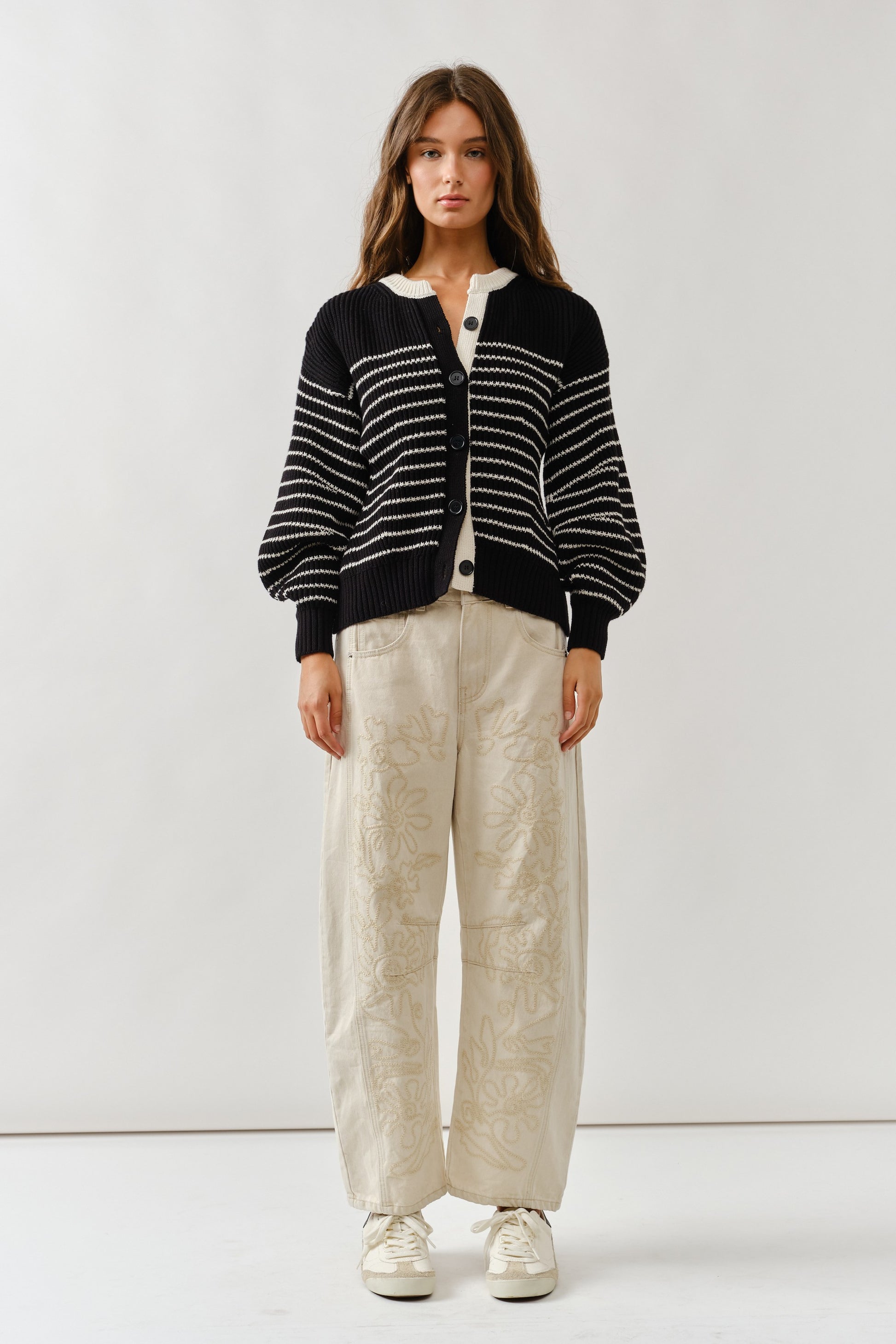 Add a modern twist to a classic look with this voluminous sleeve stripe cardigan. Featuring bold horizontal stripes, contrast trim details, and oversized balloon sleeves. The ribbed knit texture adds dimension, while the button-down front makes layering effortless. -Bold stripe pattern -Contrast placket and neckline -Voluminous balloon sleeves -Ribbed knit texture -Button-down front -Relaxed, cropped fit