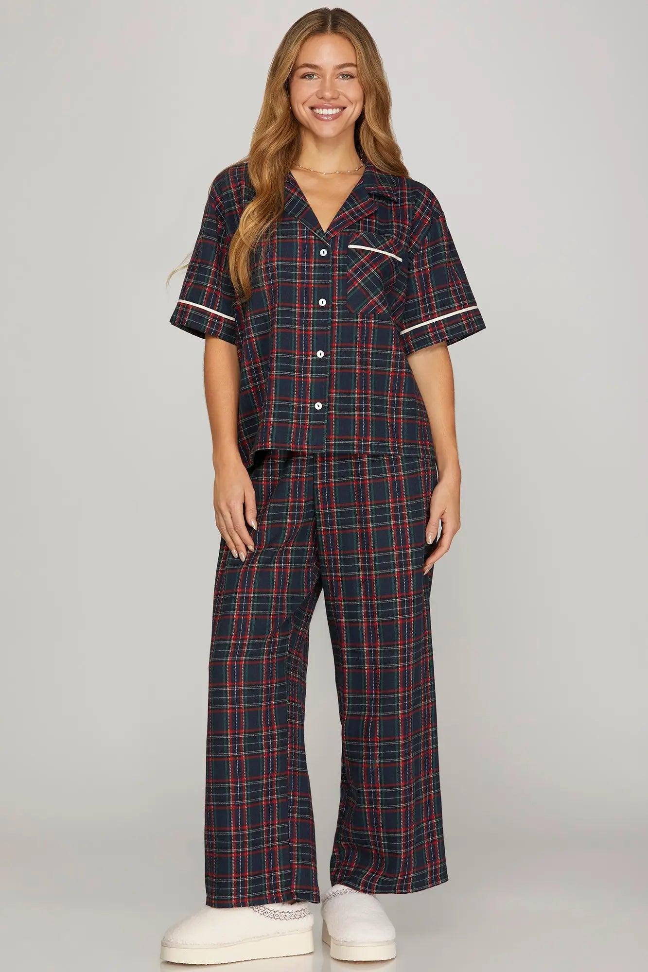 Cozy up in style with our Holiday Plaid PJ Set, featuring a charming woven plaid pattern that's perfect for festive nights in. The short-sleeve top pairs beautifully with full-length pants, both finished with contrasting piping details that add a touch of sophistication. Soft, breathable fabric keeps you comfortable all night long, while the classic plaid design works year-round. Whether you're lounging by the fire or gifting to someone special, this matching set brings warmth and whimsy to your sleepwear collection.