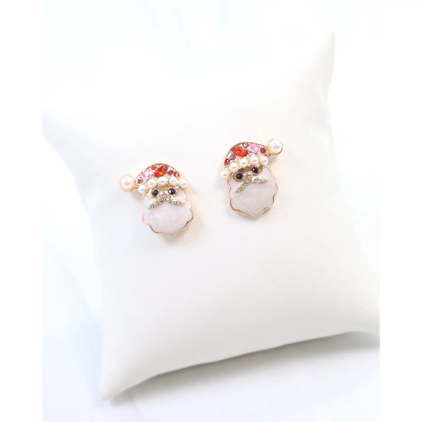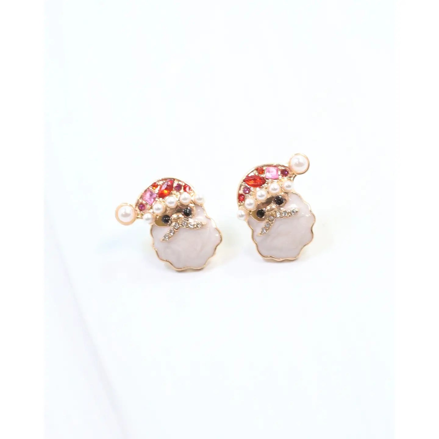 Add festive charm to any outfit with the Jolly Ole St. Nic Stud in Red. Featuring a sparkling red crystal Santa hat, a crisp white enamel beard, and a delicate pearl trim, this stylish stud captures holiday spirit with elegant detail. Perfect for accessorizing seasonal looks with a refined touch. Dimensions: * .8" Length * .5" Width