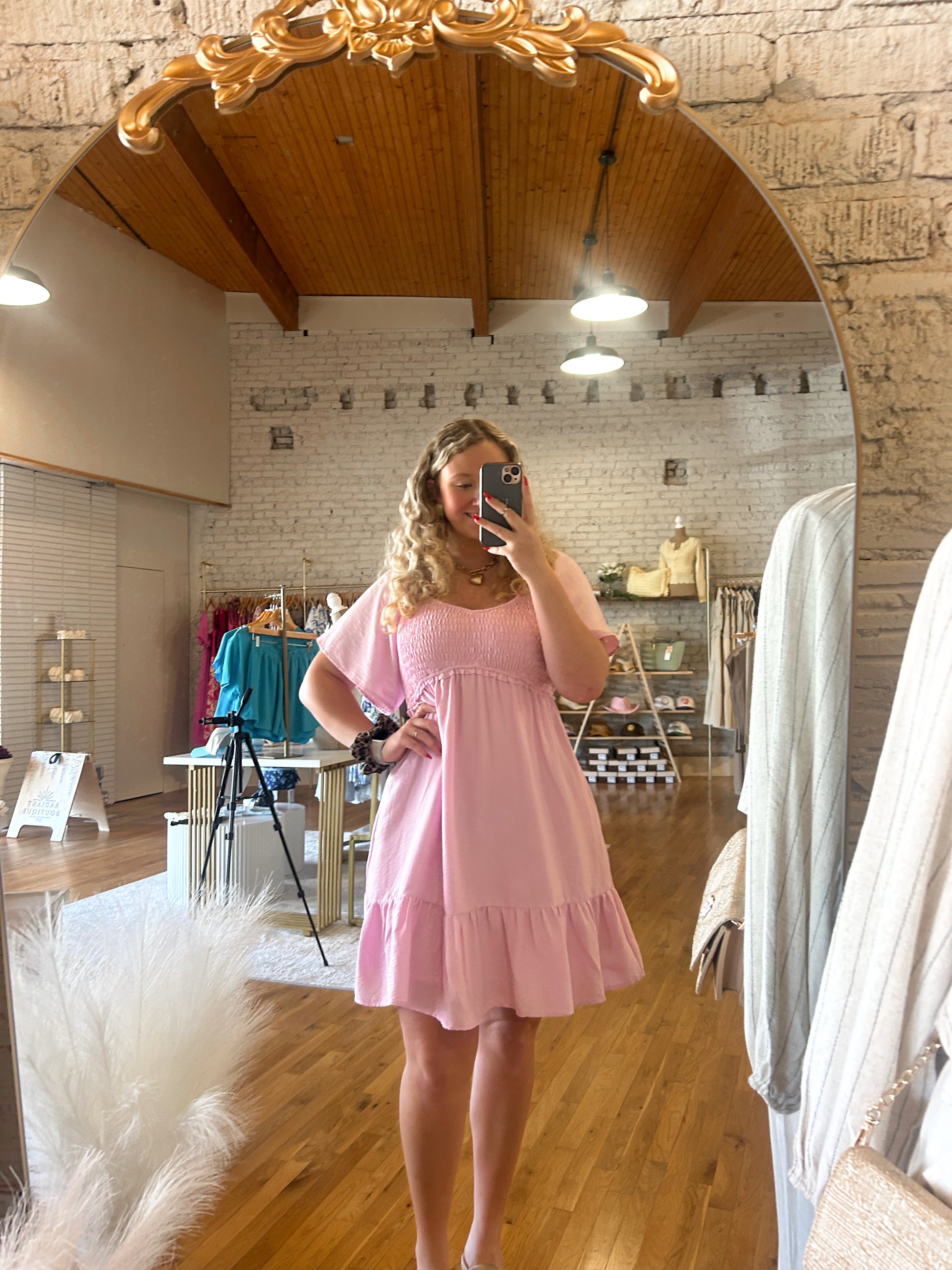 Step into a world of whimsy and charm with our Lila Mini Dress in a delightful bubble gum pink hue. This enchanting dress features a smocked bodice that beautifully hugs your figure while offering a flattering flare skirt that dances with every move. The romantic bell sleeves add a playful touch, making it perfect for daytime outings or evening soirées. Crafted from lightweight, breathable fabric, this dress ensures both comfort and style. Pair it with strappy sandals or chic heels to complete your lovable look and make a statement wherever you go!