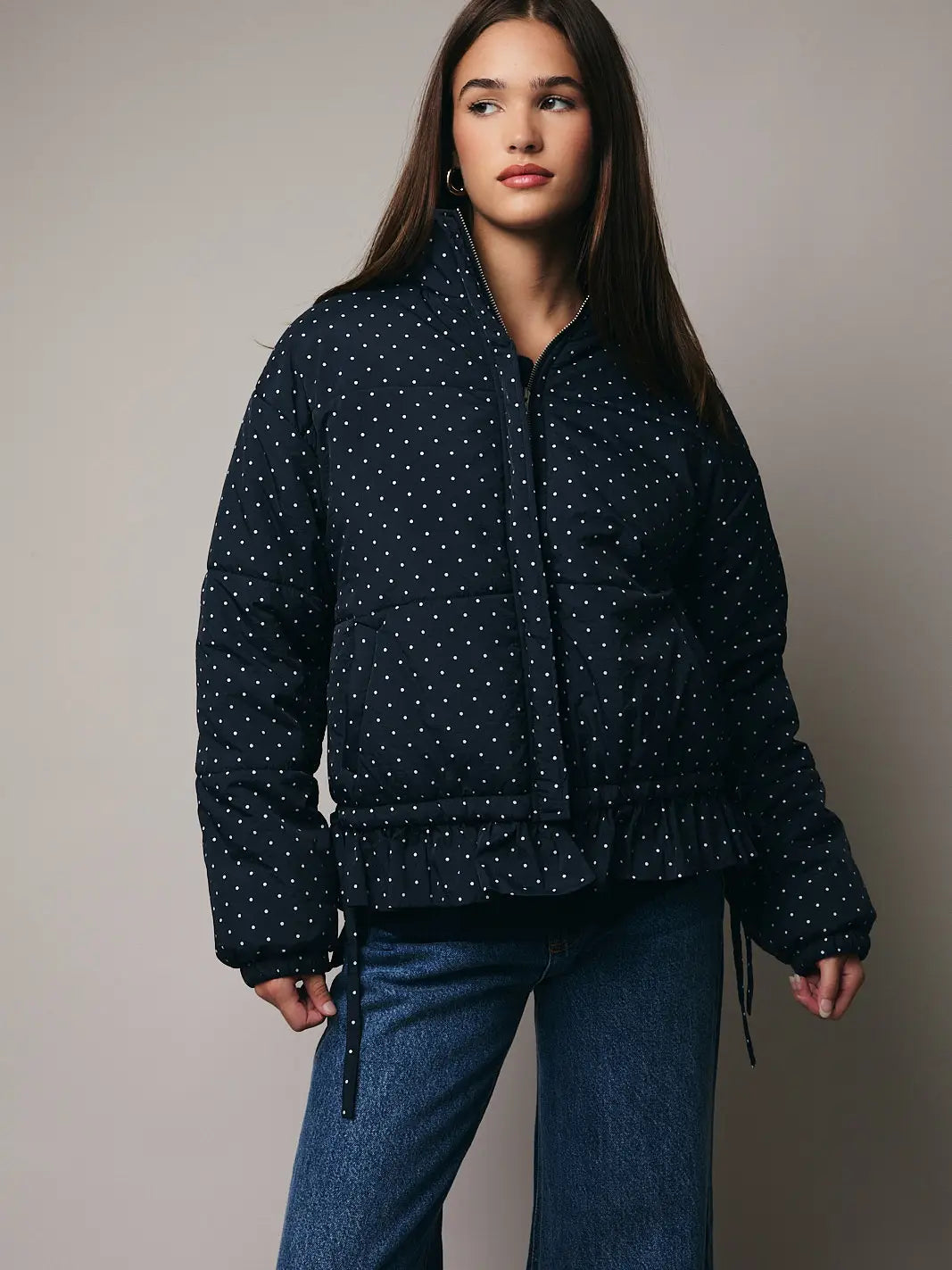 Stay cozy and cute in this navy-and-white polka dot quilted jacket! The high neckline and long sleeves provide warmth, while delicate ruffles add a touch of whimsy to your everyday look. Perfect for layering over your favorite outfits, this playful piece brings personality to any season. Whether you're running errands or meeting friends, this charming jacket keeps you comfortable and stylish.