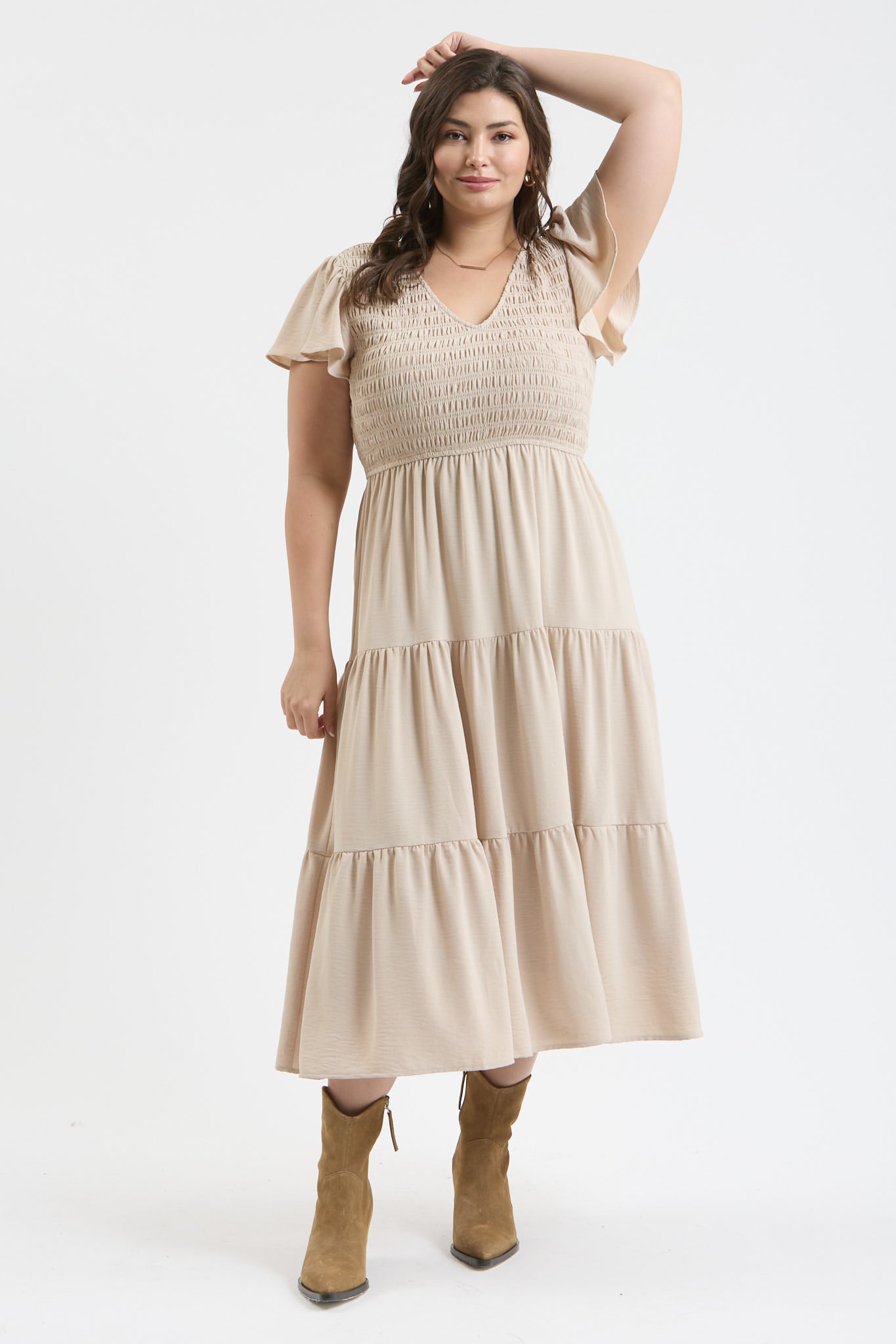 V NECKLINE FLUTTER MINI SLEEVE SMOCKED BODICE TIERED MIDI SKIRT LINED SKIRT SHELL: 100% POLYESTER LINING: 100% POLYESTER